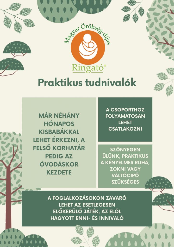 A foglalkozások 30 percesek. Szőnyegen ülünk, a gyerekek ölben vagy szabadon mozognak. Oldott légkörben mondókázunk, ölbeli játékokat játszunk vagy épp hangszeren hallgatunk meg egy-egy dallamot. Sokat ismétlünk, hogy a dalokat, verseket és játékokat növekvő kedvvel és bátorsággal otthon is bármikor tudjátok énekelni, játszani.
